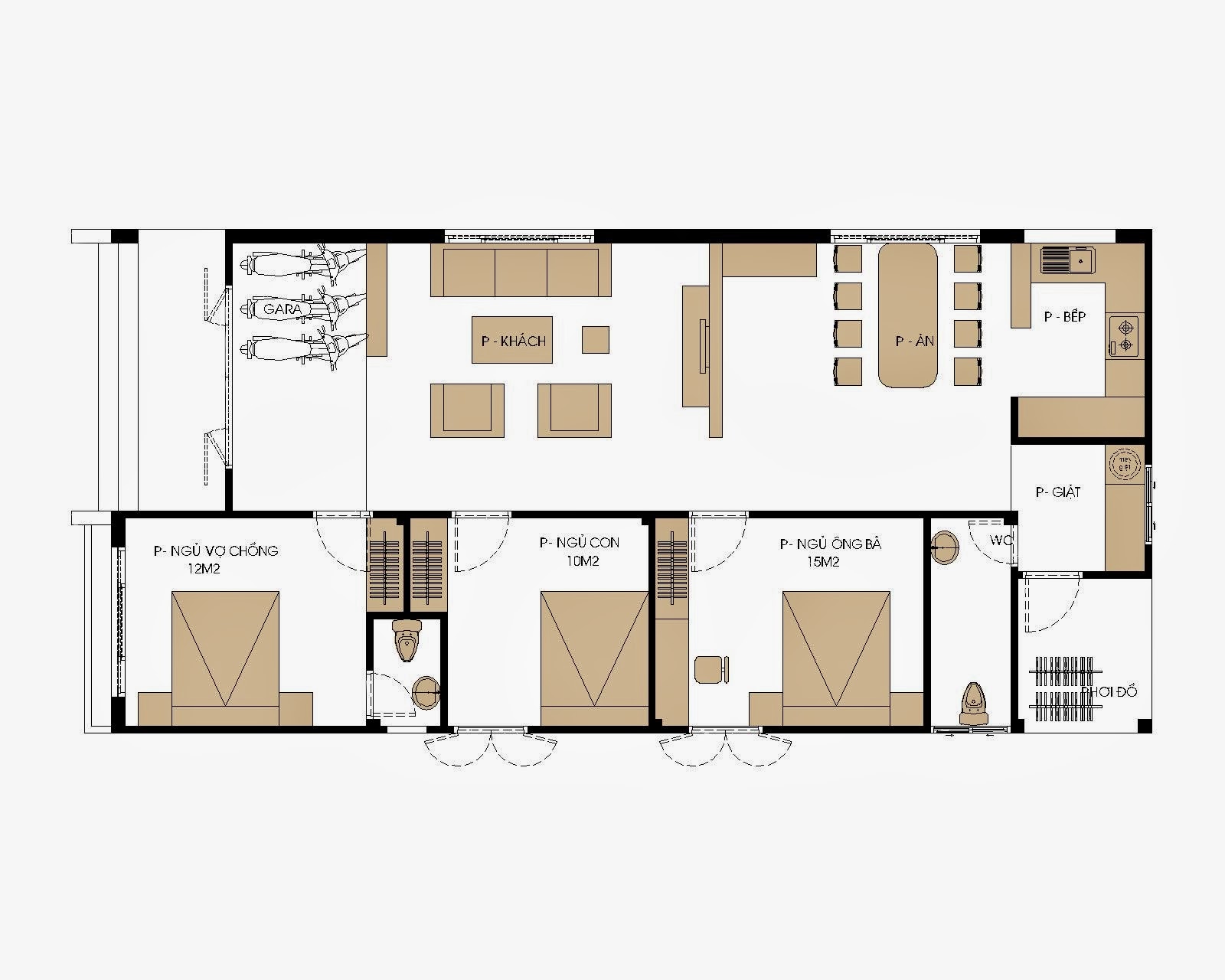 Bản Vẽ Nhà Cấp 4 3 Phòng Ngủ 7x15