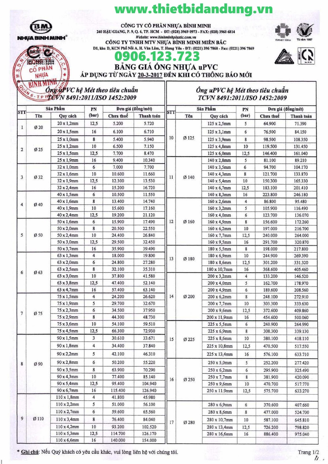 Bảng Bao Gia Phụ Kiện Upvc Binh Minh Mới Nhất Ap Dụng Từ Ngay 15 12 2017