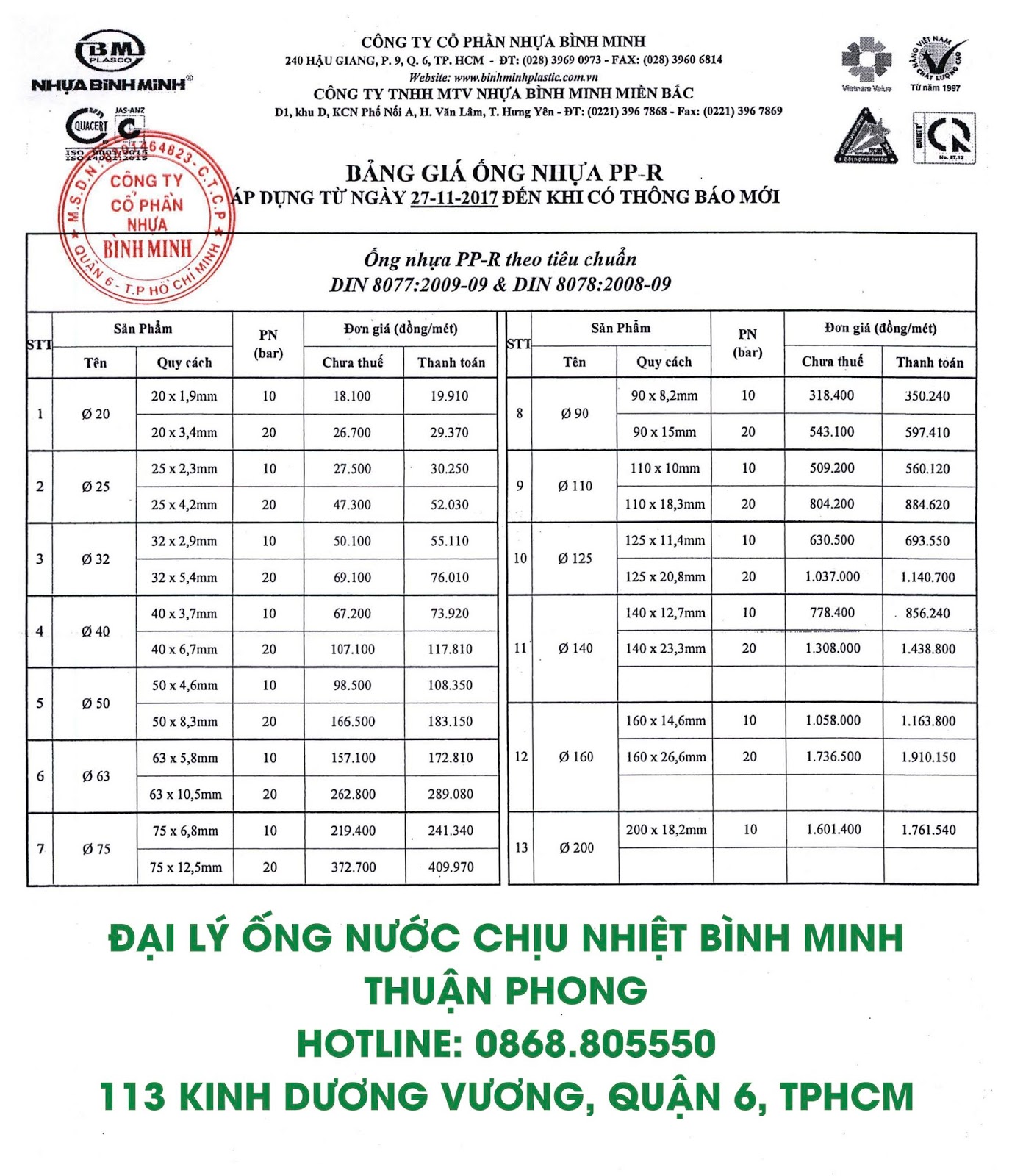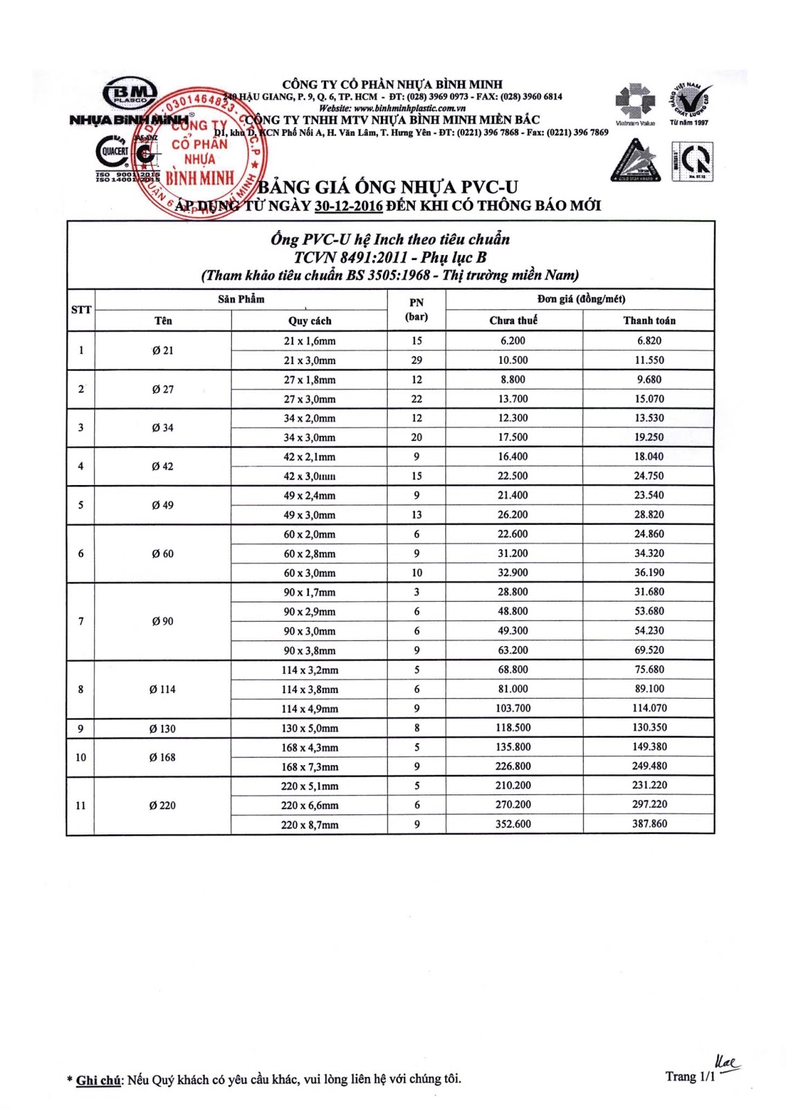 Bang Gia Ong Pvc Noi Tron Binh Minh Tmt Home Mart