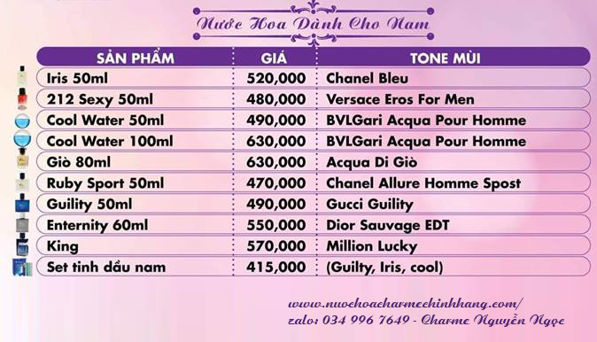 Bảng Gia Nước Hoa Charme Nam Nữ 2019 2020 Chinh Hang Mới Nhất