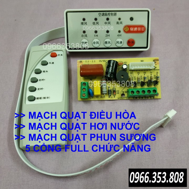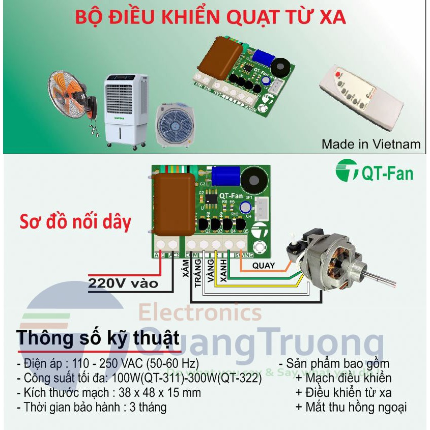 Bộ mạch điều khiển từ xa cho quạt. Bộ điều khiển gồm 1 mạch điều khiển 1 điều khiển quạt romote. Nút điều khiển quạt và đèn riêng biệt. Bộ mạch điều khiển quạt từ xa đa năng v1 là bộ thiết bị dùng để chế quạt thường thành quạt có thể điều khiển từ xa hoặc bật tắt trực tiếp bằng phím mềm thay vì công tắc cứng như truyền thống. ăng ten cho tầm điều khiển tốt.