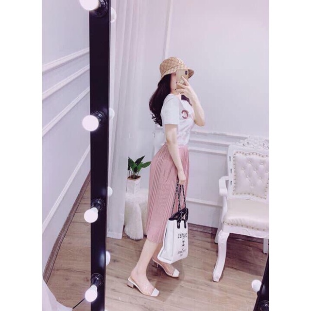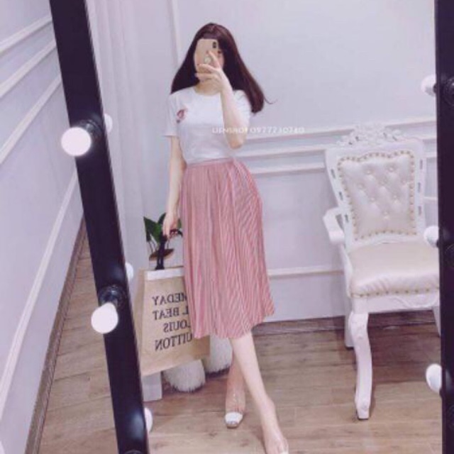 Chan Vay Xếp Ly Dai Qua Goi Mau Hồng Mix Voi Ao Thun Trắng