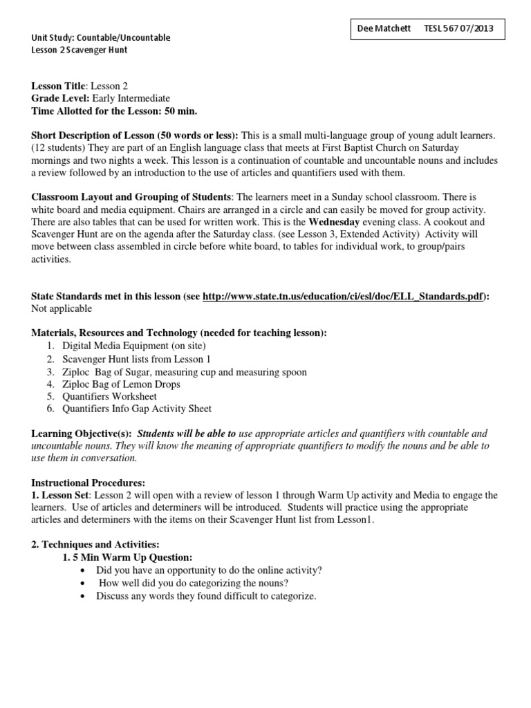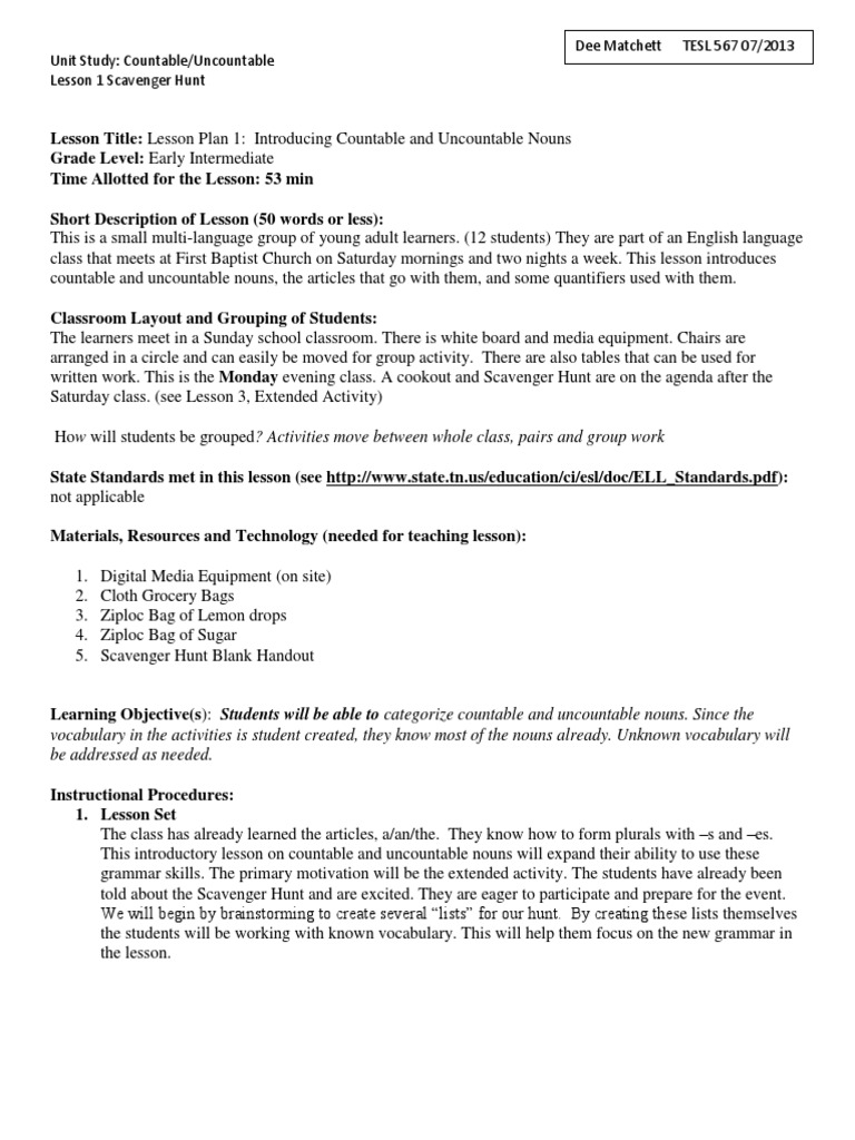 Esl Lesson Plan On Countable And Uncountable Nouns